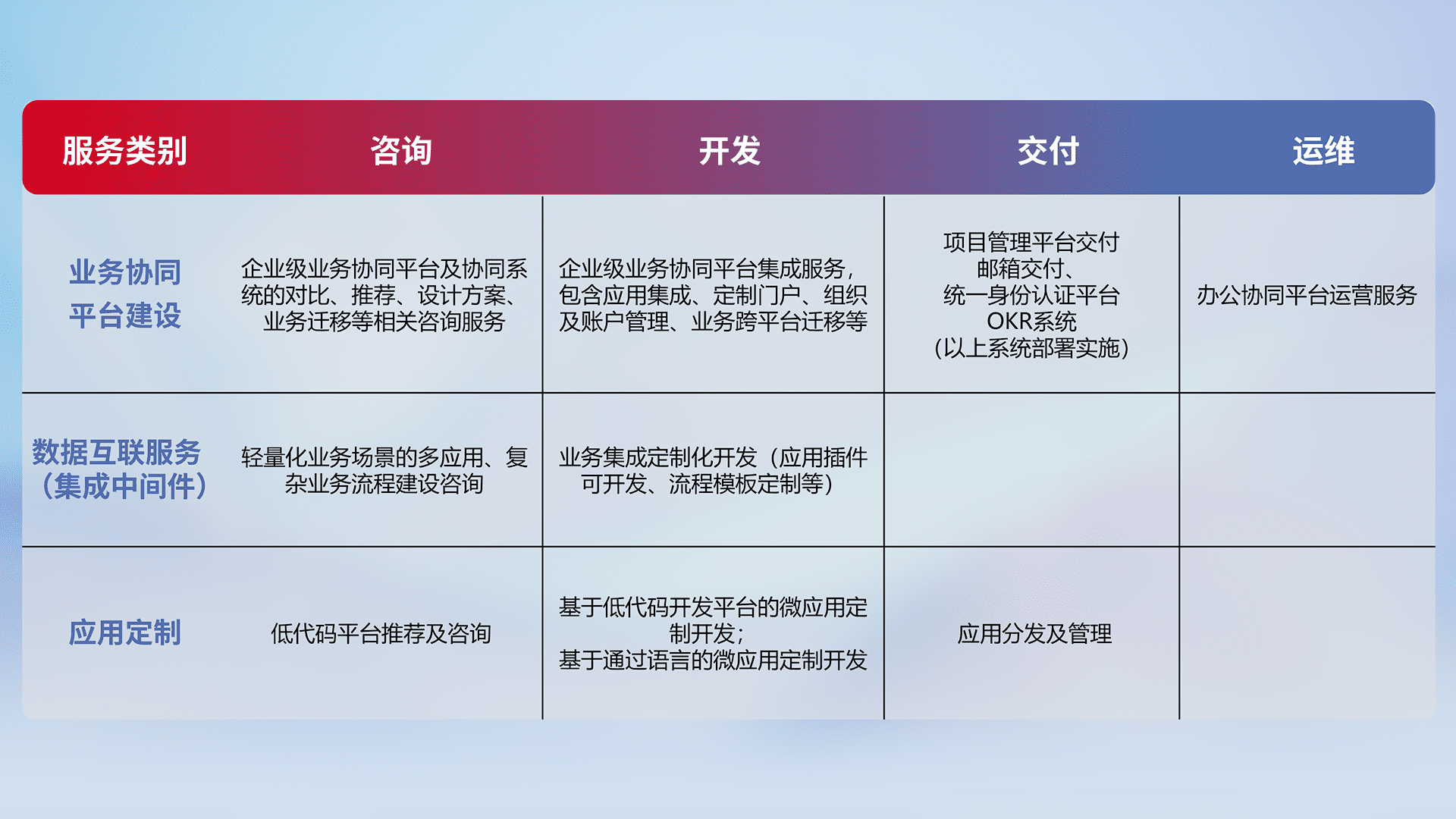 针对钉钉、、企微、、、IDaas等平台级产品提供产品的规划、、方案、、、、交付、、定制化开发等服务,,实现如统一协同办公、、智能客户服务、、、、混合会议管理、、、智能数据查询、、、等业务场景,,,,实现数字化转型。。
